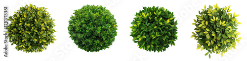 Four spherical green plants with varying shades and leaf arrangements, displayed in a line.