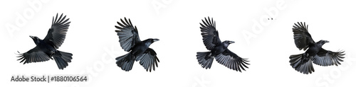 Four stages of a crow in flight wings spread dynamically captured in a sequence on transparent background
