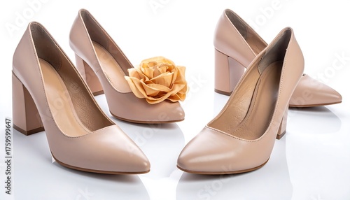 Four stylish high-heeled pumps are displayed on a glossy white surface. Two have a classic design, and another pair feature a decorative flower detail