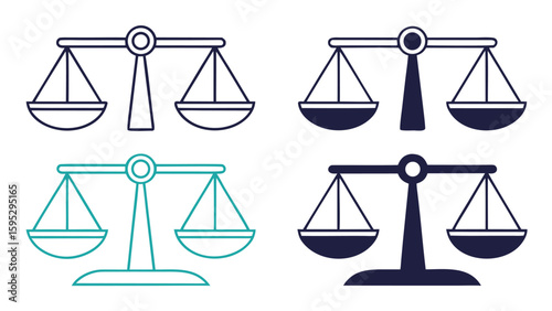 Four stylized illustrations of balance scales representing justice and equality
