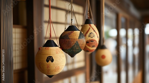 Four traditional Japanese woven ornaments hanging from a ceiling.