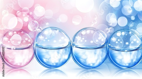 Four transparent spheres reflecting gentle bokeh lights in pastel pink and blue gradient hues