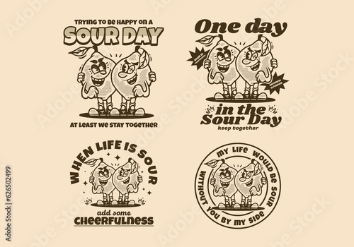 Four t-shirt design of Two lemons mascot character illustration in vintage style