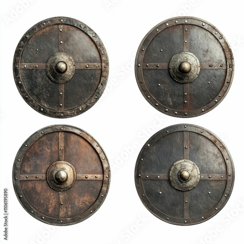 Four weathered, round metal shields; rivets, central boss.