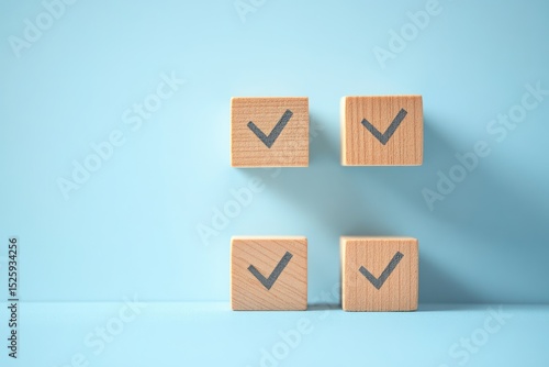 Four wooden blocks with check marks arranged in a square on a light blue surface with shadows