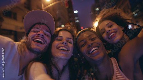 Four young adults are smiling and taking a selfie at night, illuminated by city lights. They have a joyful expression, showcasing friendship and celebration in an urban setting.