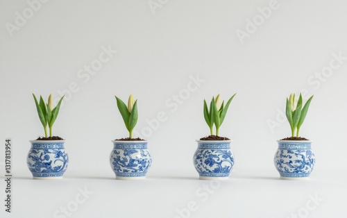 Four Young Tulip Plants in Blue and White Ceramic Pots on White Background