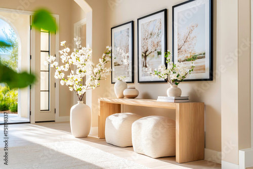 Foyer design with neutral console and triple symmetrical decorative elements