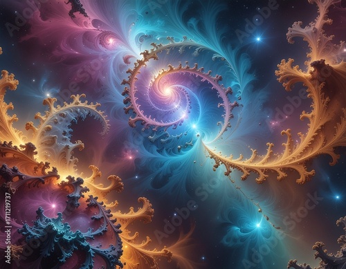 Fractal patterns expanding in space, Midjourney AI-generated