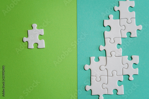 Fragment of a folded white jigsaw puzzle and a pile of uncombed puzzle elements against the background of a colored surface.