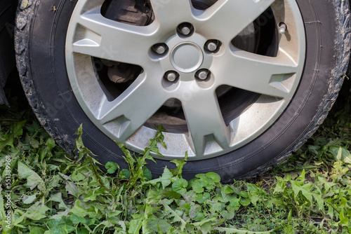 Fragment of car wheel on grass, side view close-up
