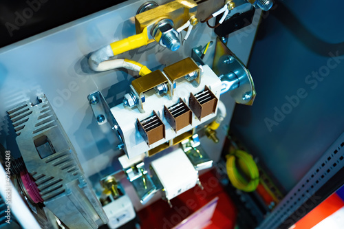 Fragment of electrical or network equipment. The interior of the electrical equipment. The insides of electrical equipment with wires and fasteners. Electronics repair concept.