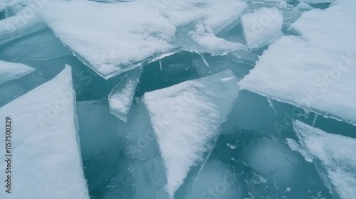 Fragmented Ice on Turquoise Water Surface in Winter Landscape