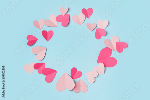 Frame made of pink paper hearts on blue background. Valentine's Day celebration