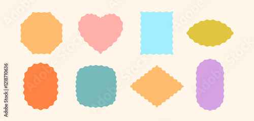 Frames Scalloped Vector Corrugated Shapes Set. Scallop Frame Wavy Retro Stickers Collection. Zig Zag Edge Geometric Borders Tag Boxes. Wiggle Line Design Sign Backgrounds. Isolated