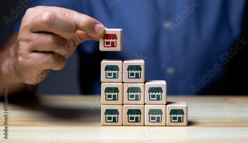 Franchise business, business people hand pick a wooden block with a distinctive store franchise marketing icon.