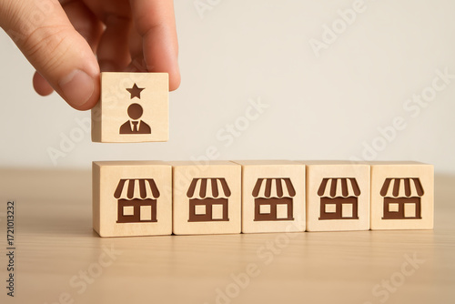 Franchise concept with wooden blocks showing retail store icons and hand holding block with business person symbol representing small business success and growth