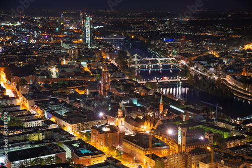 Frankfurt am Main, big skyline at night. Train station, railway, bank district.