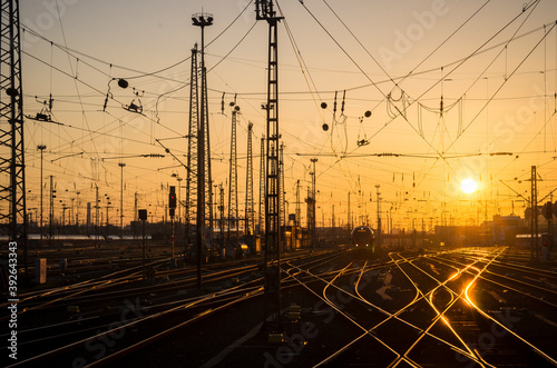Frankfurt am Main, Germany - February 08 2020: Beautiful view of railway lines during sunset at central railway station in Frankfurt am Main, Germany.