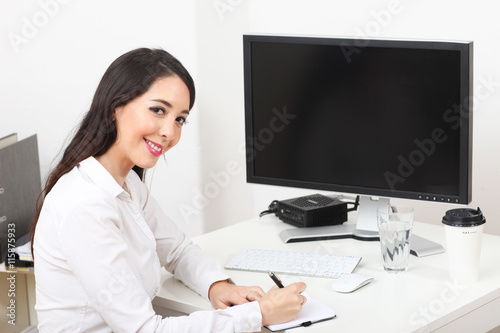 Frau schreibt an Ihrem Schreibtisch