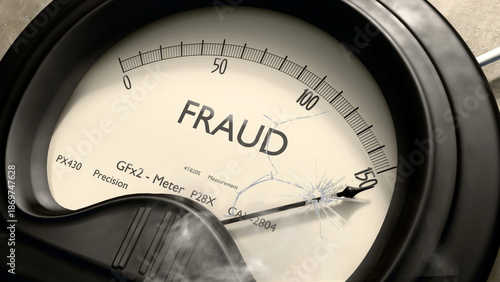 Fraud meter showing high levels of fraud. Dangerously increasing values of fraud, critical overload. Too much, off the charts. Max fraud ,3d illustration