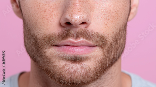 Freckles across male nose bridge in macro detail with well groomed beard and soft pink lips against pastel pink background, showing natural skin texture and facial hair