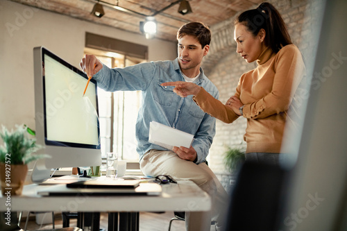 Freelance workers communicating while working together on desktop PC.