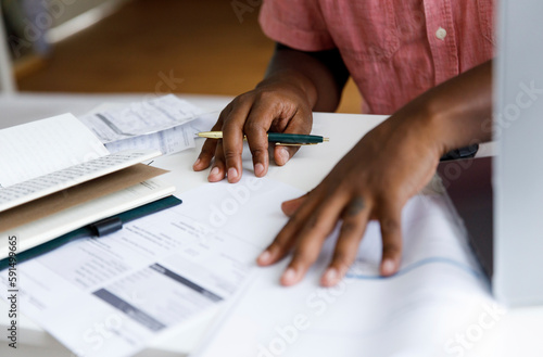Freelancer examining financial bills at home