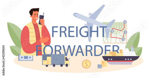Freight forwarder typographic header. Loader in uniform delivering