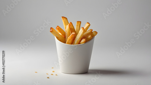 French fries in white cup with cheese sauce on white background. Deep fry potato or appetizer.