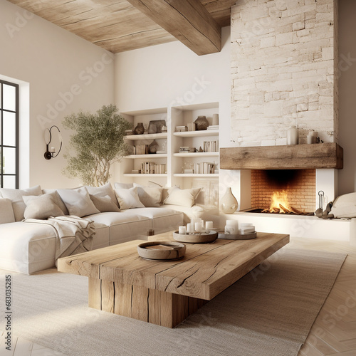 French interior for a modern room. A table made of wooden slabs next to a white corner sofa with fur pillows. A fireplace with a fire burning in it. Modern direction in design.