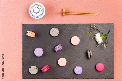 French macarons or macaroons, and incarnation white flower on a slate, with chopsticks and traditional chinaware tea bowl.