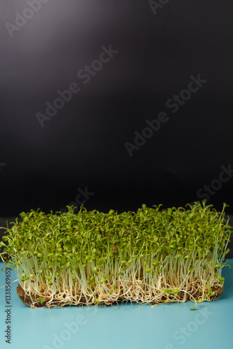 Fresh alfalfa microgreen shoots on blue mat, black background. Organic raw food seasoning. Kitchen garden. Copy space