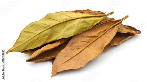 Fresh and dried tobacco leaves of Nicotiana tabacum showcasing texture and color variations on a white background