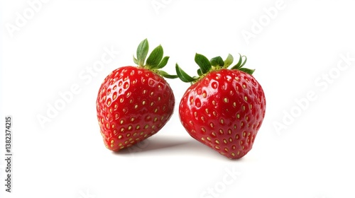 Fresh and ripe strawberries with vibrant red color showcasing their natural texture and green leaves in a simple setting, isolated on white background