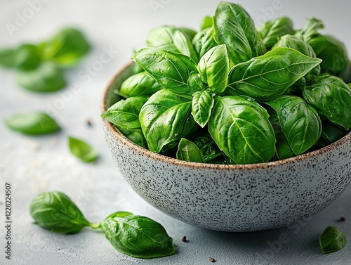 Fresh basil leaves arranged in a bowl, highlighting culinary use.