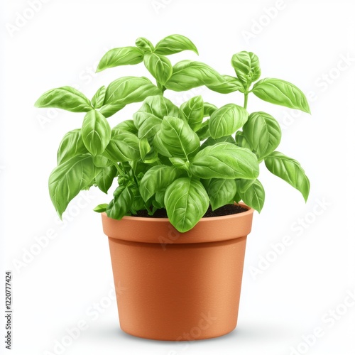 Fresh Basil Plant in Terracotta Pot with Vibrant Green Leaves on a White Background
