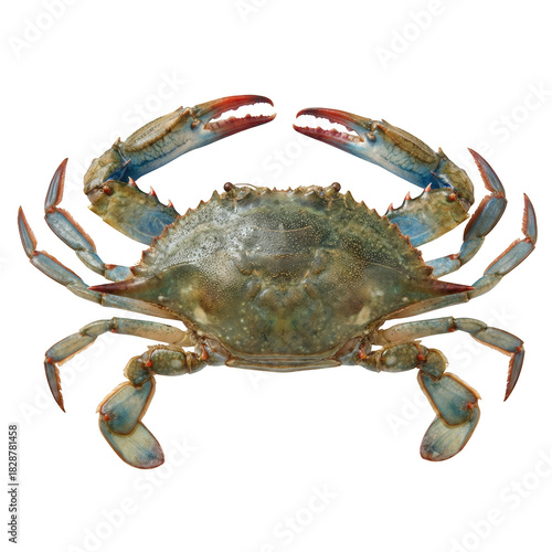 Fresh blue crab crustacean with claws up in an aggressive pose. Raw seafood and marine life delicacy from ocean