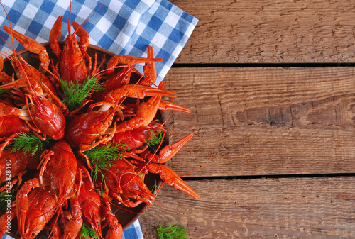 Fresh boiled crayfish with dill on a large plate