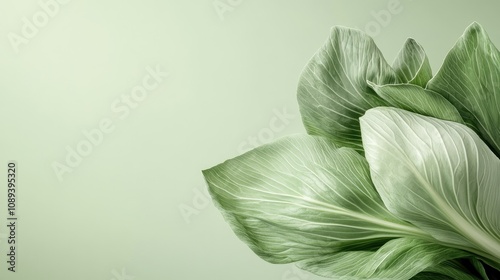 Fresh bok choy cabbage leaves arranged aesthetically on a soft green background, highlighting their crisp texture and vibrant color.