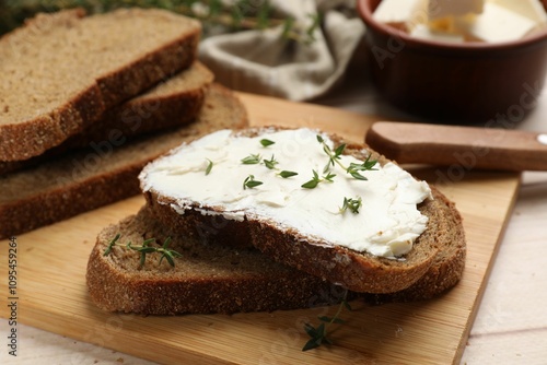 Fresh bread with butter, thyme and knife on light table, closeup