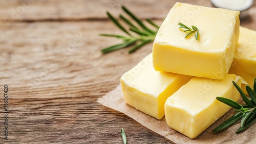 Fresh butter cubes on a wooden surface with rosemary, perfect for culinary use and food photography.