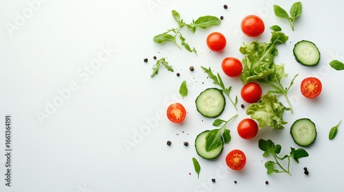 Fresh cherry tomatoes, cucumbers, and lettuce on white surface