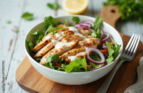 Fresh chicken salad with grilled chicken breast slices red onion tomato and greens in white bowl. Creamy dressing poured over top. Healthy meal on wooden board.
