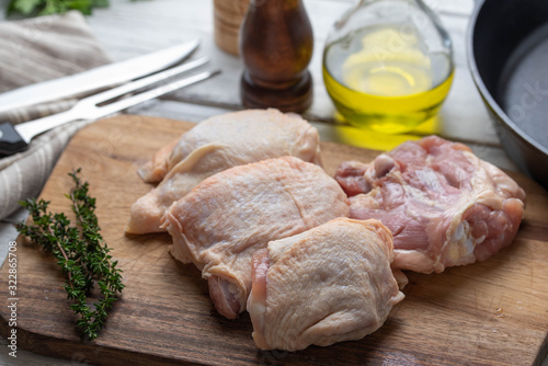 fresh chicken thigh on wooden cutting board