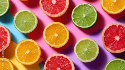 Fresh citrus slices, lime, orange, and grapefruit halves arranged on background creating bright and refreshing pattern