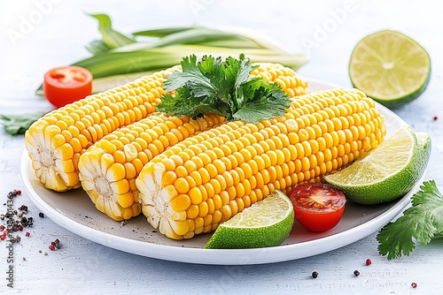 Fresh corn on the cob with lime and herbs arranged on a plate in a bright kitchen setting
