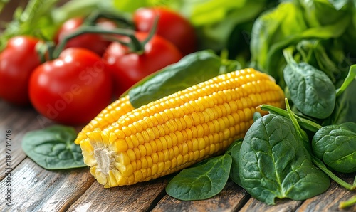 Fresh corn, tomatoes, spinach on wood. Healthy eating