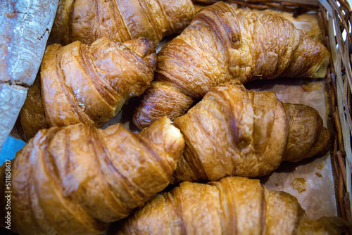 Fresh croissants on parchment paper. Crispy croissant