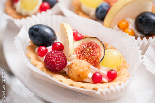 Fresh cupcake muffins with raw berries. Sweets decorated